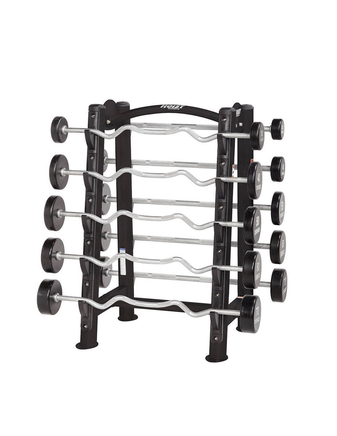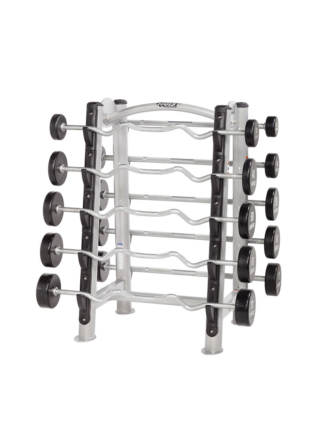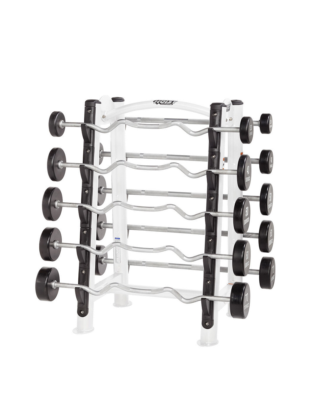 Ce rack sur deux faces peut stocker 10 barres droites ou EZ, sans les abîmer ni abîmer le châssis grâce aux protections en polyuréthane qui recouvrent les crochets métalliques.
