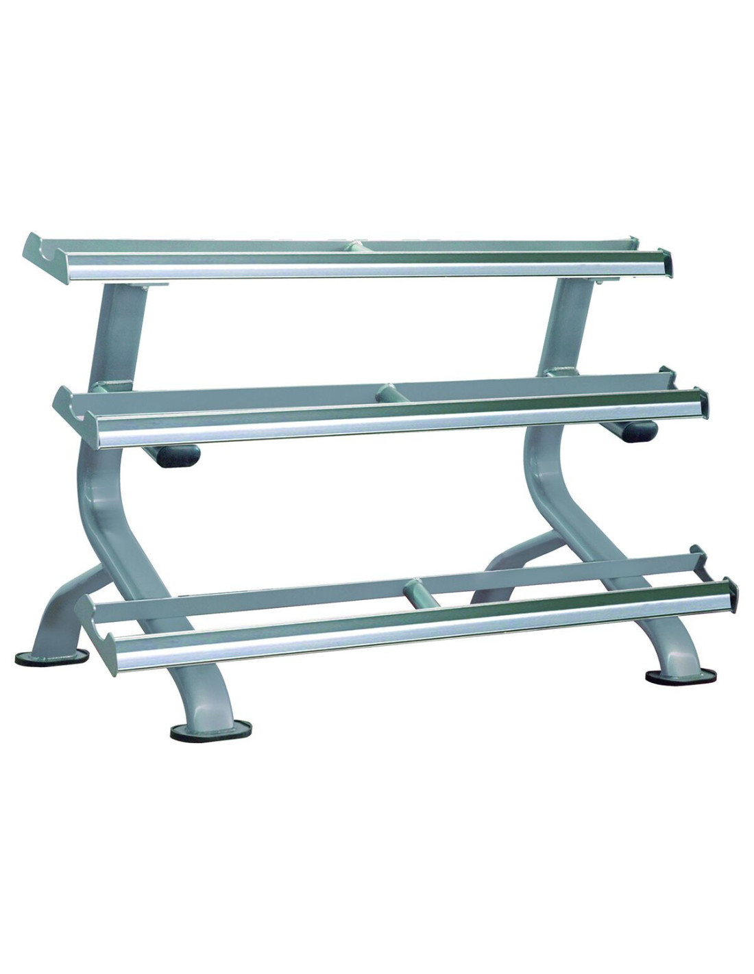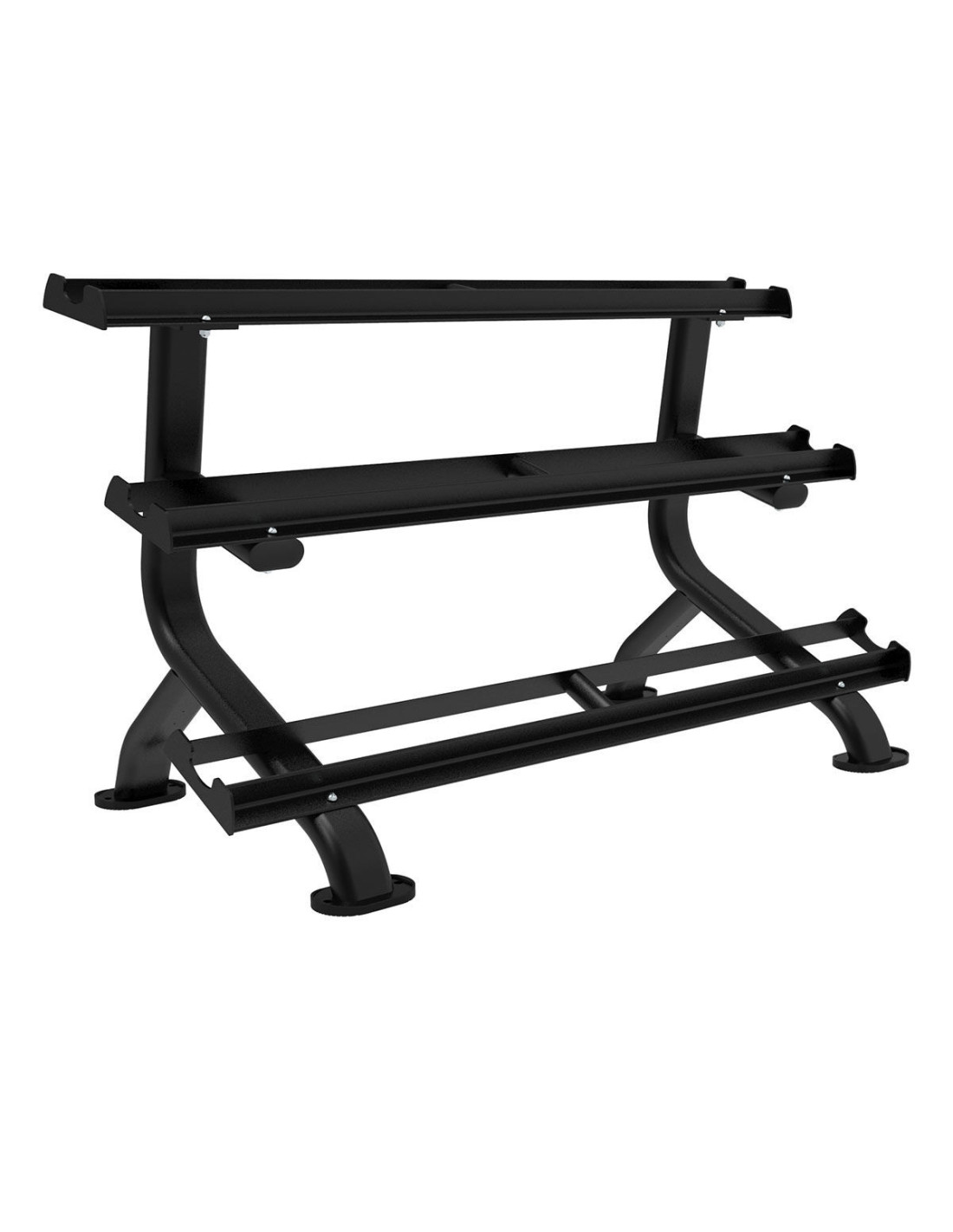 L'angle de chaque niveau et le décalage permet de ranger tous vos haltères quel qu'en soit le poids. Cette architecture permet aux utlisateur de facilement prendre et ragner les tous poids - y compris les plus lourds. Cette facilité les incite naturellement à ranger les haltères après utilisation. La strcuture métallique permet de ranger jusqu'à 200 kg par niveau.