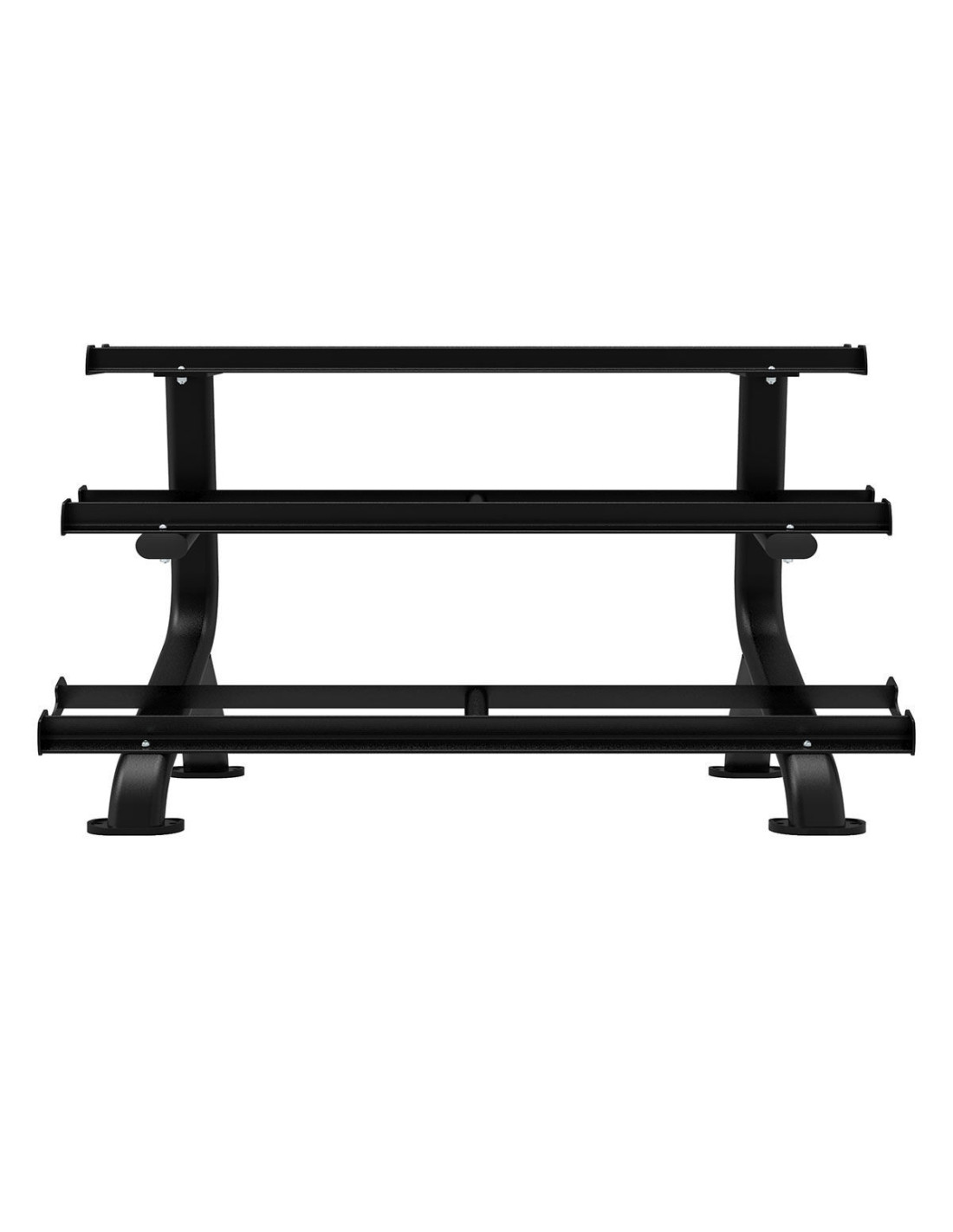 Le range haltères professionnel Impulse IT7018 dispose de trois niveaux, répondant ainsi aux besoins de rangement d'haltères hexagonaux dans un espace limité. Sa hauteur modérée ne bloque pas la visbilité dans le miroir d'entraînement.