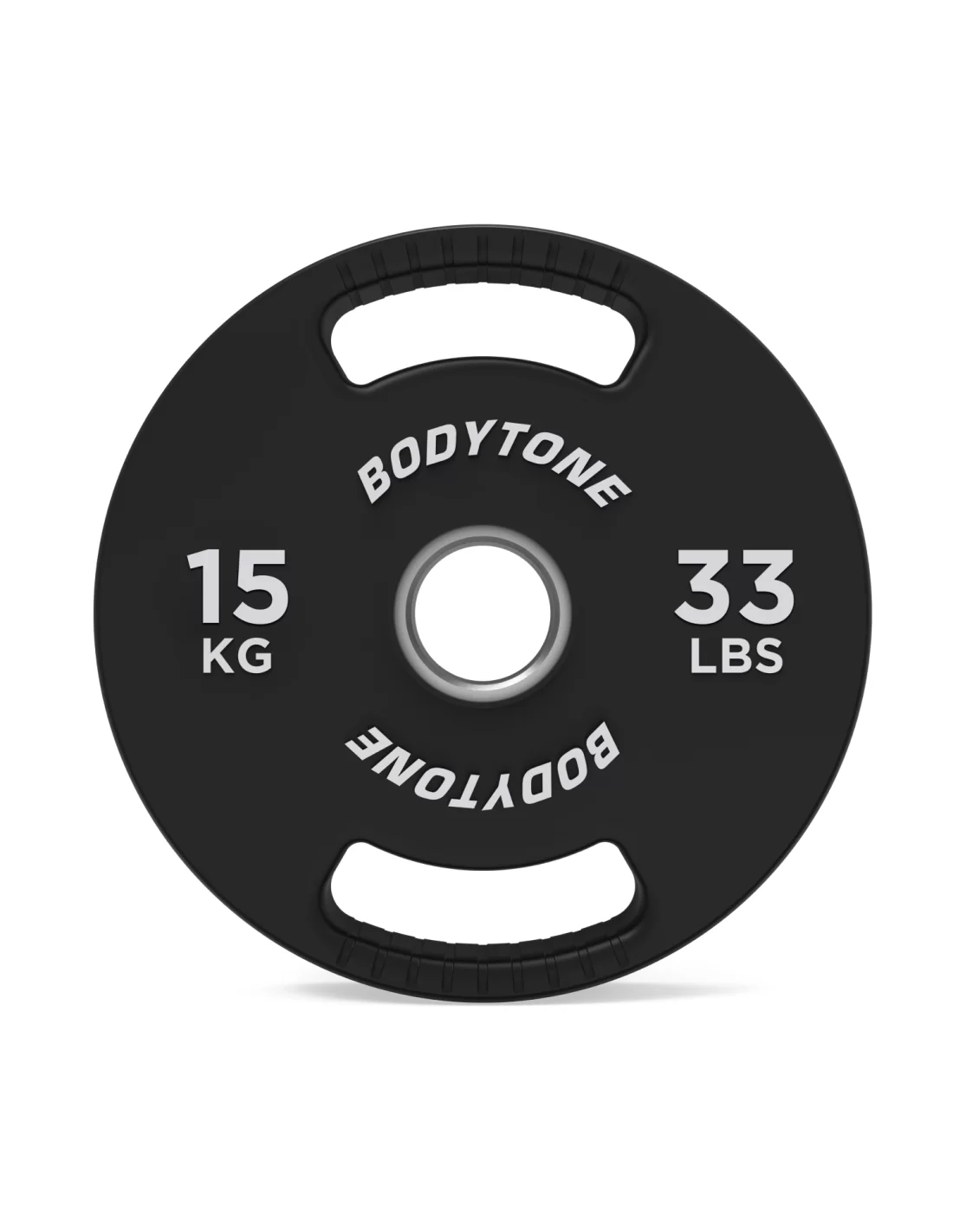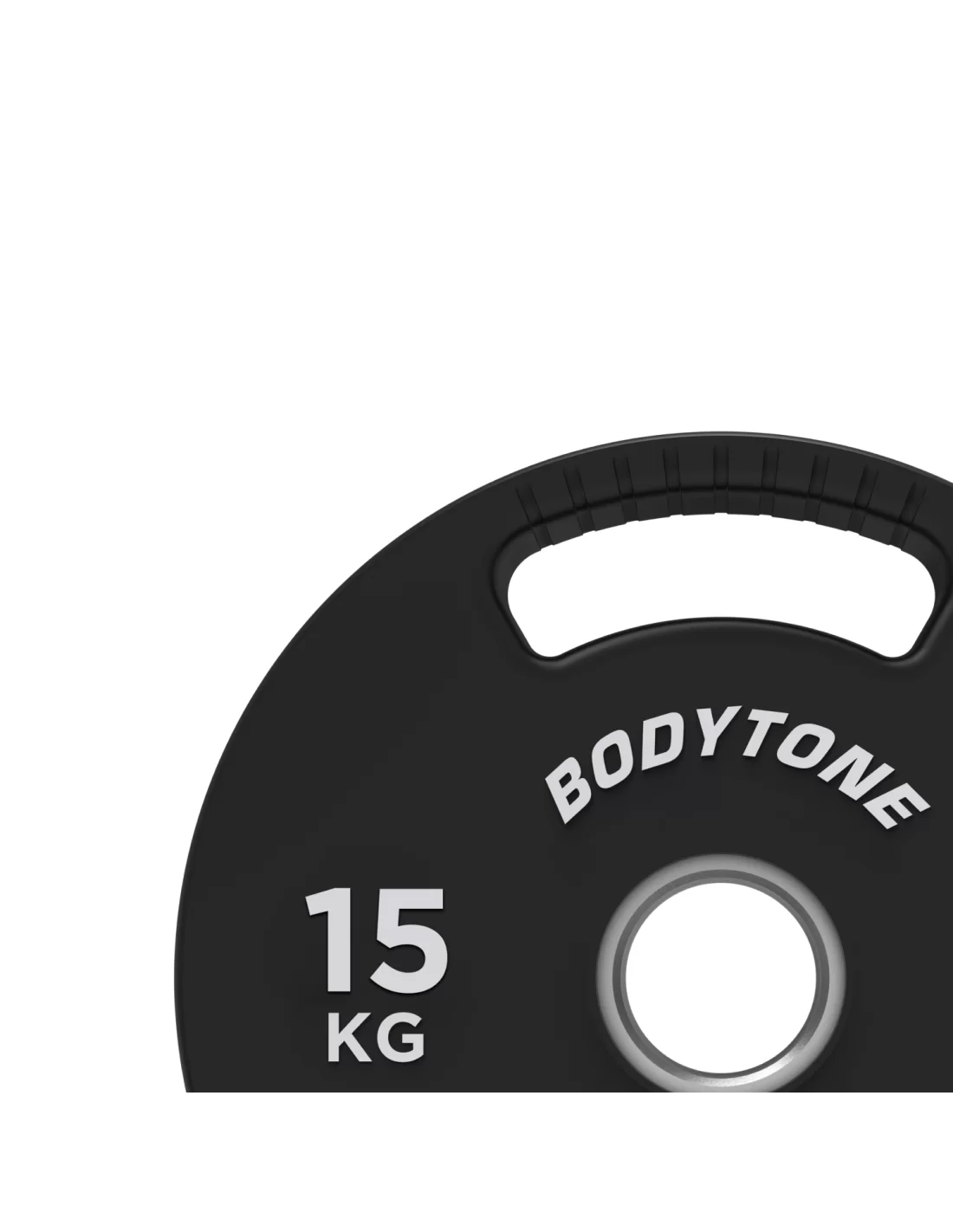 Der 15 kg schwere olympische Gummi-Diskus von Bodytone besteht aus hochwertigem, stoßfestem Gummi. Es hat einen Durchmesser von 50 mm und einen Stahlring im zentralen Loch. Dank der Griffe ideal für Langhanteltraining oder Eigenkörpergewichtsübungen.
