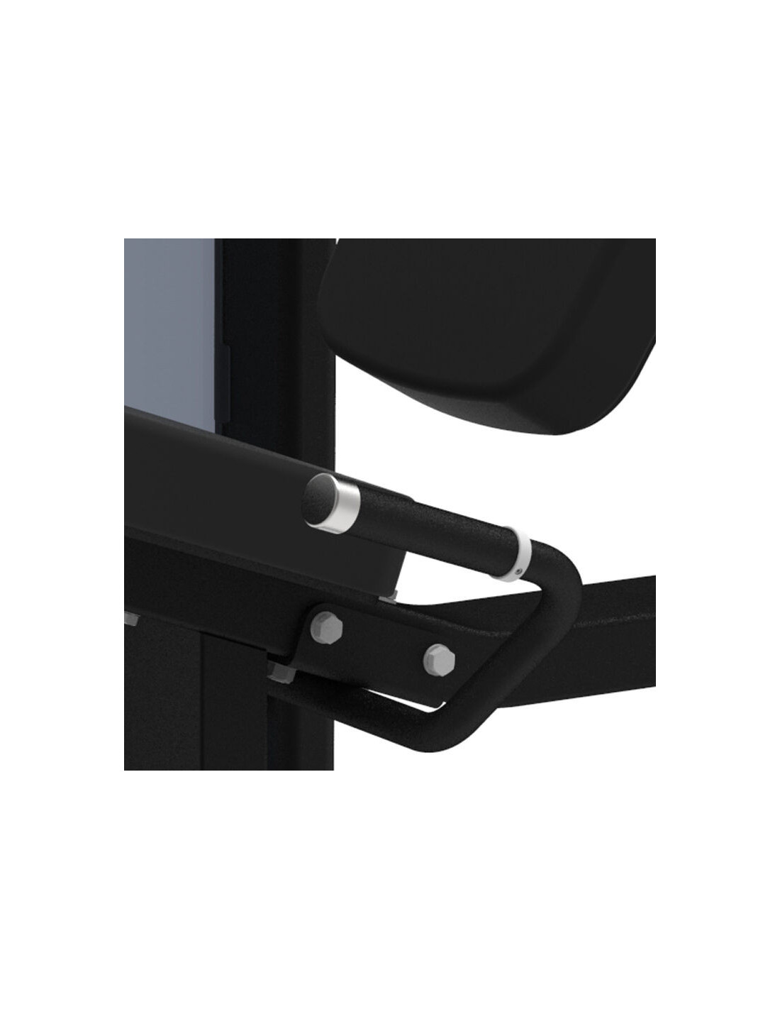 Le repère de pivot en jaune permet aux utilisateurs d'obtenir une position d'exercice correcte facilement et rapidement. Le dossier dispose d'un réglage en profondeur manipulable d'une seule main. L'assise ergonomique offre un bon confort et réduit les contraintes sur les ischio-jambiers pendant l'entraînement. Le rondin cale-jambes est réglable en hauteur sur plusieurs positions pour correspondre aux différents gabarits d'utilisateur. Il dispose de deux poignées pour s'installer et descendre facilement ou pour fournir une aide à l'effort.