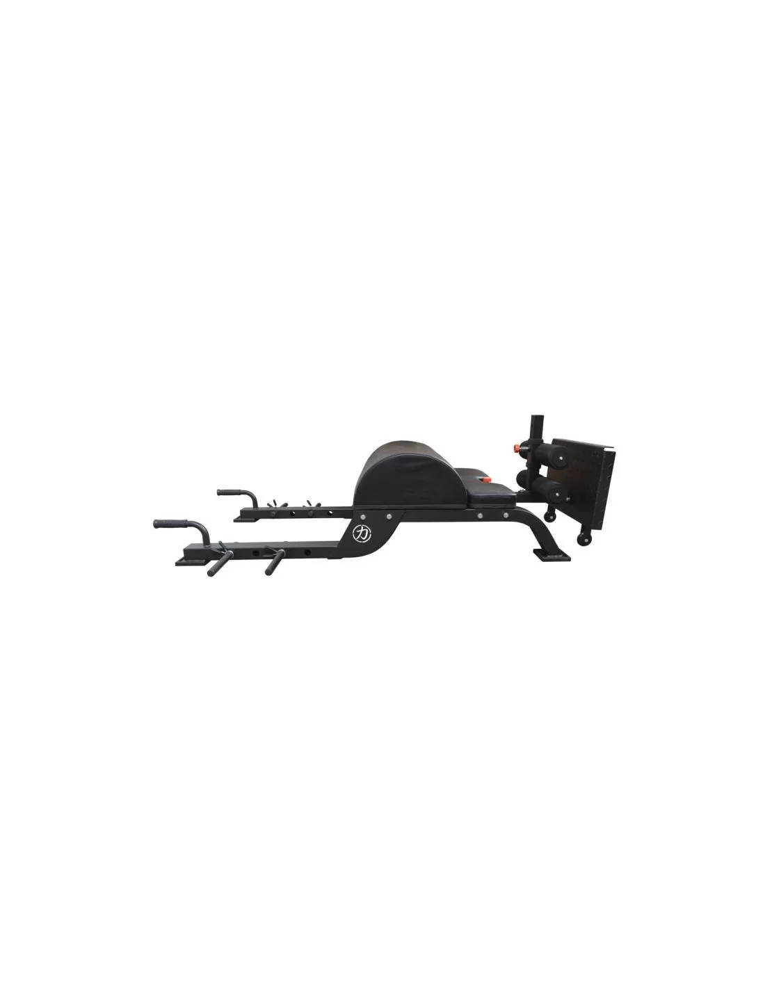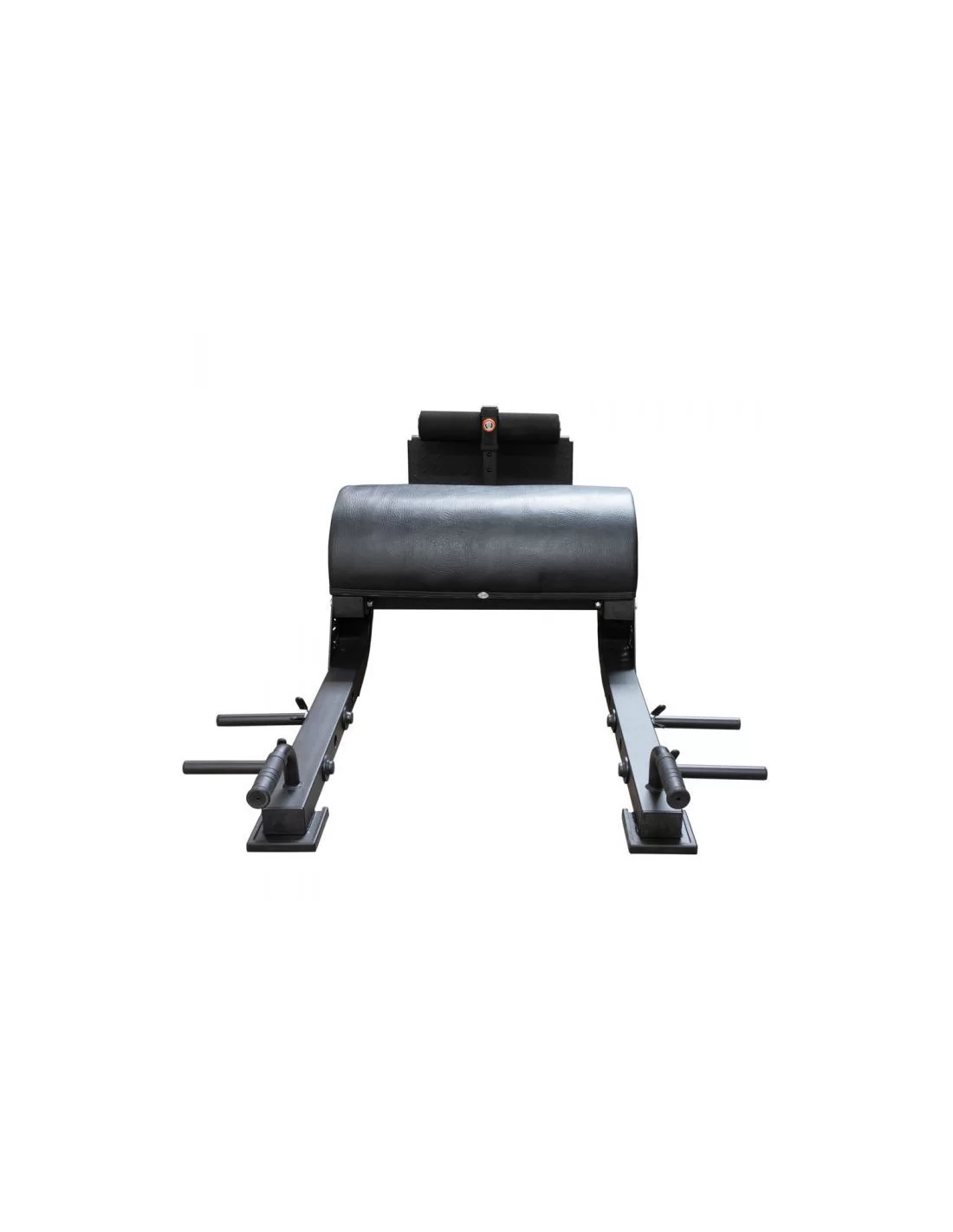 The machine combines both a hip thruster pad section and an adjustable height, floor glute ham developer.