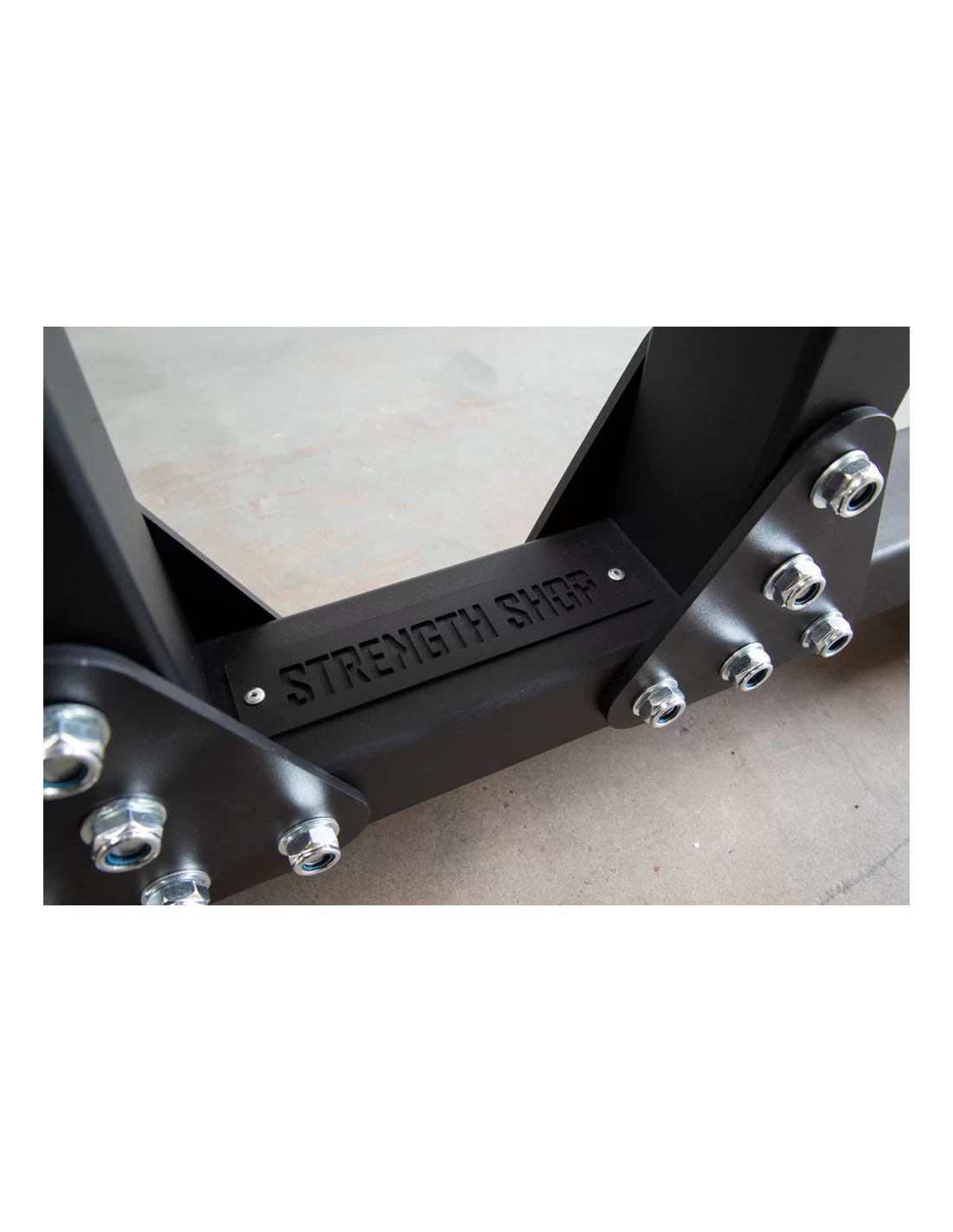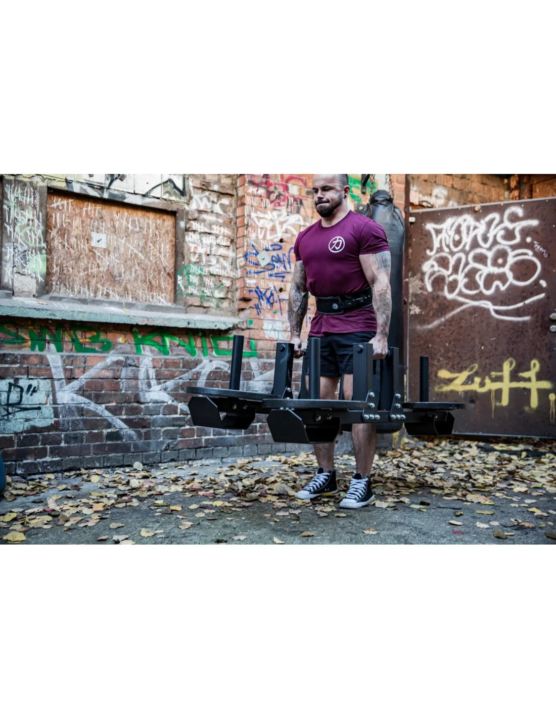 Cuando diseñamos estos mangos quisimos mejorar ciertos aspectos de otros modelos. Una característica particular son los pies de la base, que se han elevado del suelo para evitar lesiones al dejar caer pesos pesados. También son más anchos para aumentar la estabilidad de la empuñadura en el suelo. Hemos fijado la altura del asa en 43 cm (comparable a la del dólar de plata en peso muerto) para emular la altura inicial de recogida en las competiciones. Su peso y robustez (aprox. 30 kg cada una) ofrecen una sensación de seguridad al caminar o correr y facilitan la carga y retirada de las placas.