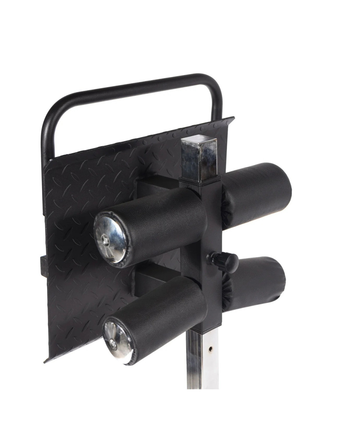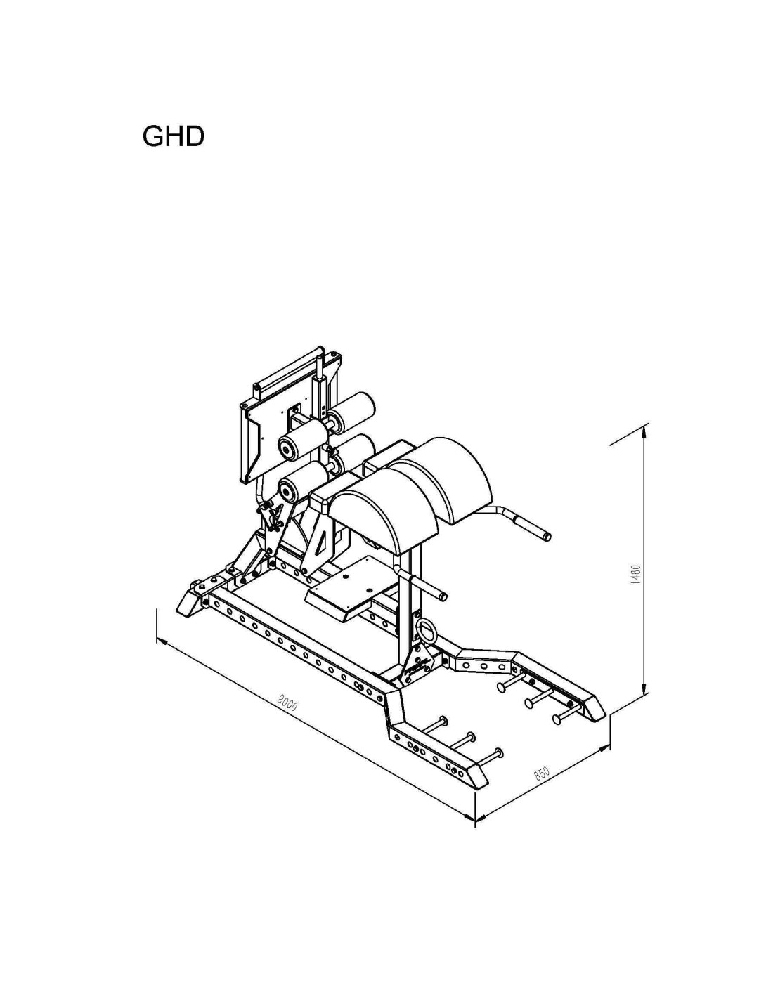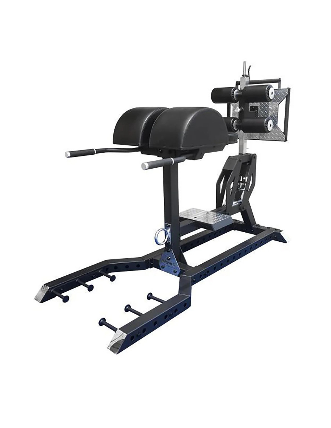Conçu en acier commercial de 3 mm et recouvert d'une finition mate Nero/Grigio, le GHD de la série Primal Pro est doté de coussins surdimensionnés et résistants aux déchirures, ainsi que de supports ajustables en hauteur et en longueur grâce à des broches à libération rapide. Les supports pour les pieds sont équipés de capuchons métalliques pour protéger le rembourrage.
