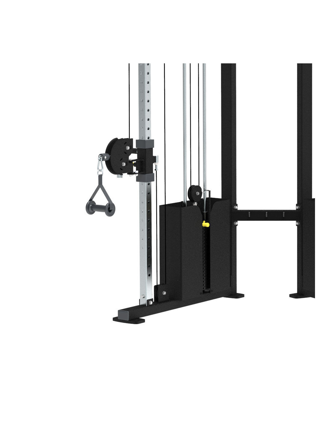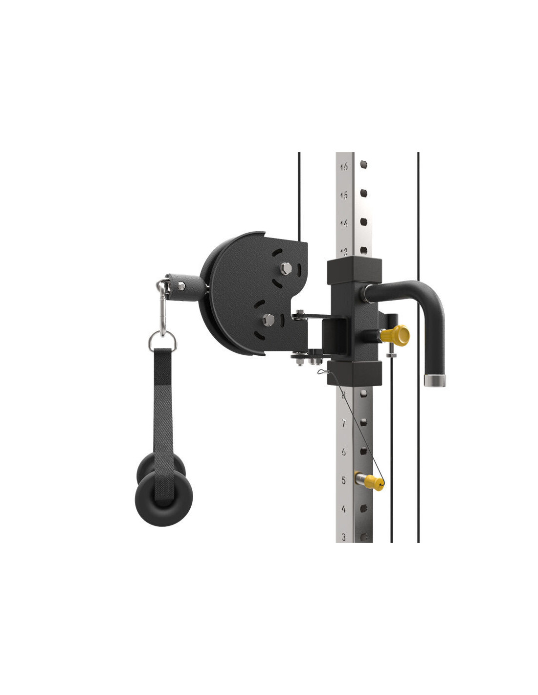 Cette double poulie dispose d'une barre de traction intégrée. Les points de tirage sont réglables en hauteur sur 30 positions et disposent d'une goupille de sécurité additionnelle. Pivotant sur 180°, ils procurent une grande liberté de mouvement latérale, permettant ainsi à deux personnes d'utiliser l'appareil en même temps grâce aux deux colonnes de charge de 91 kg chacune.