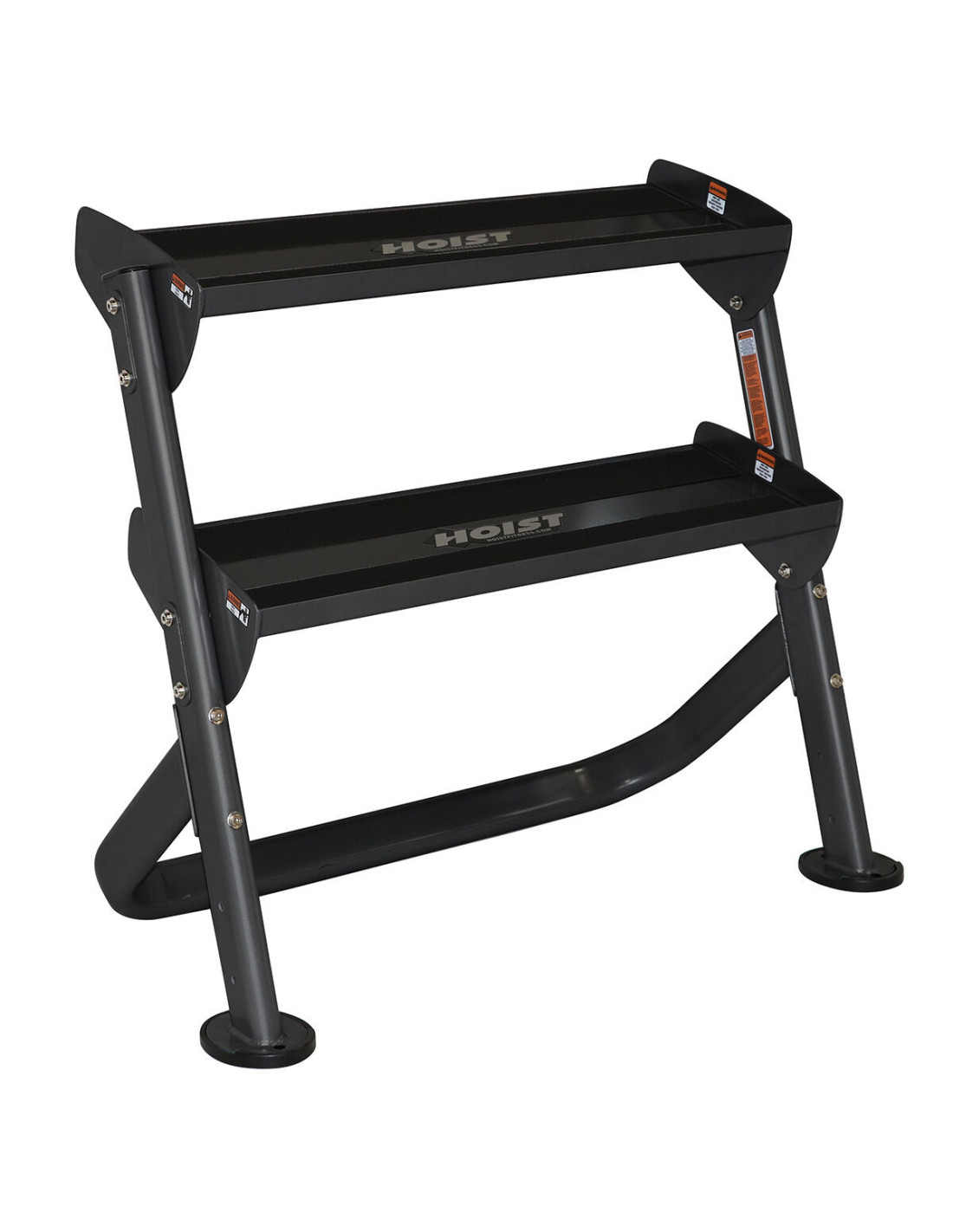 Le range haltères & kettlebells horizontal semi-professionnel Hoist Fitness HF-5461-36 dispose de deux niveaux pour stocker jusqu'à 8 paires de la plupart des haltères hexagonaux de 1 à 12 kg.