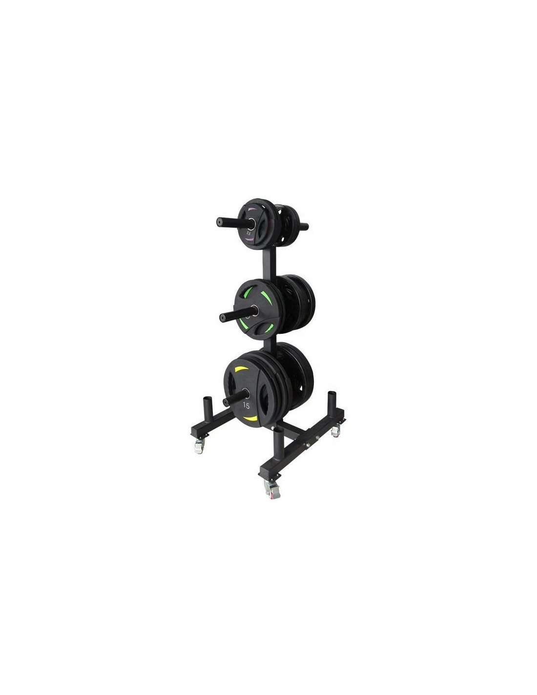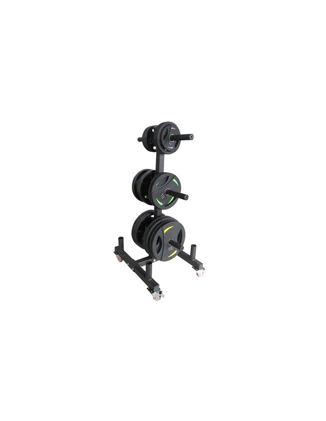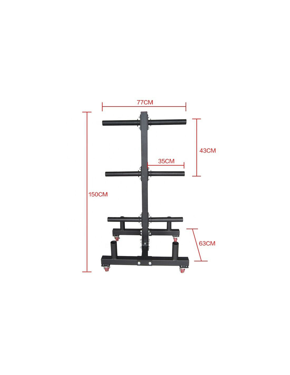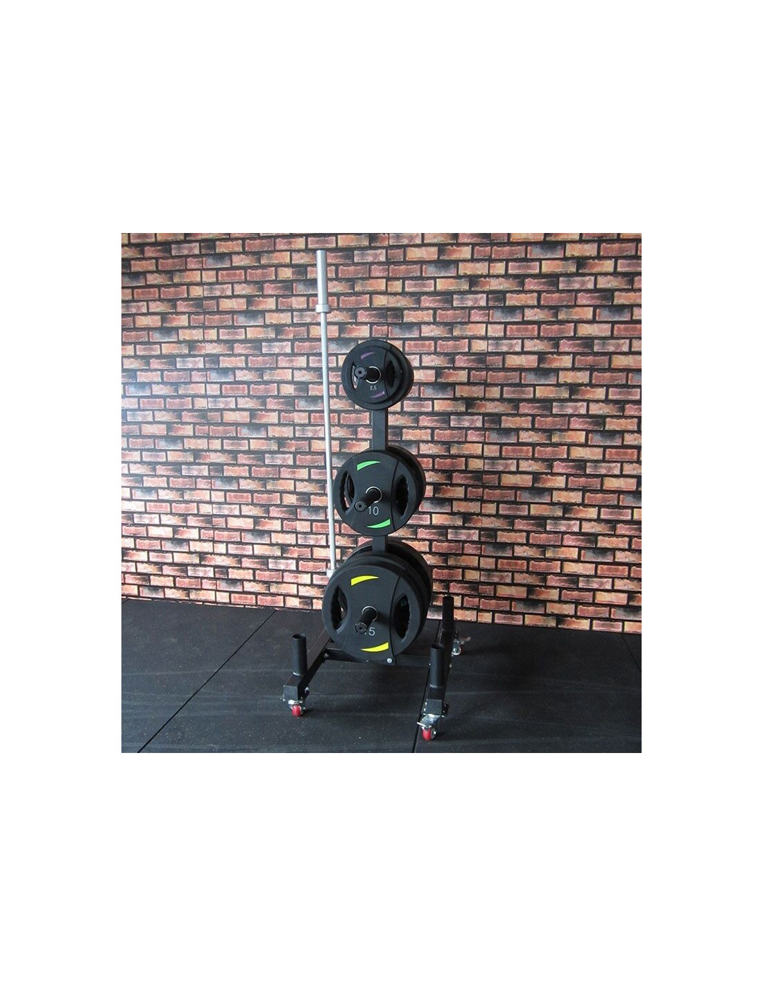 Ce rack de rangement olympique combine range-barres vertical et range-disques en un seul module. Il comprend 6 épis olympiques pour vos disques et 4 support olympiques pour vos barres. Il se déplace facilement grâce à ses 4 roulettes verrouillables.