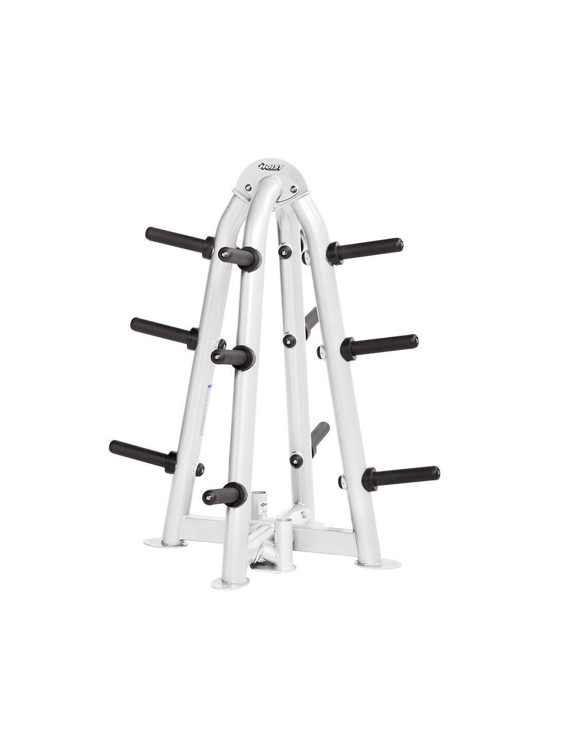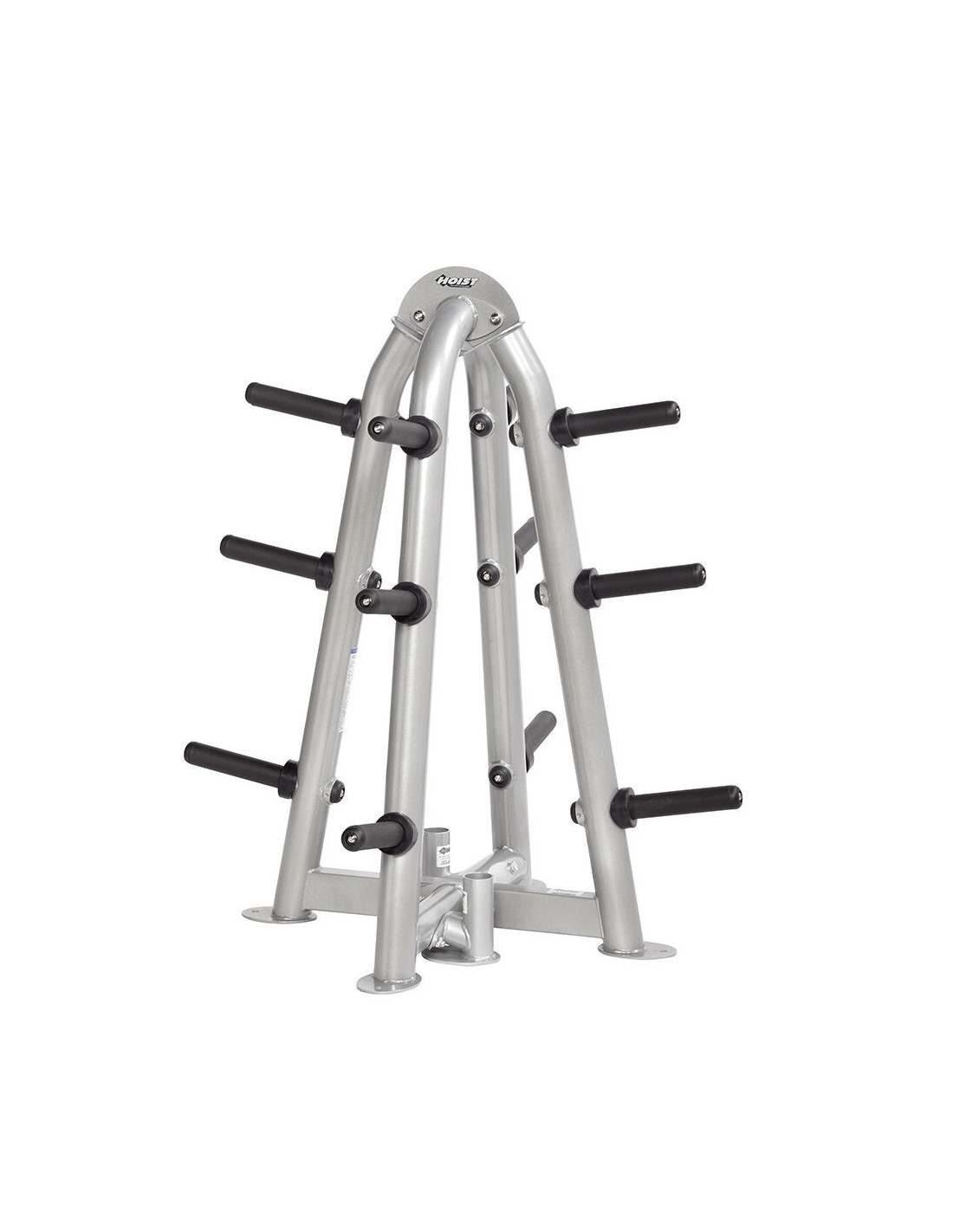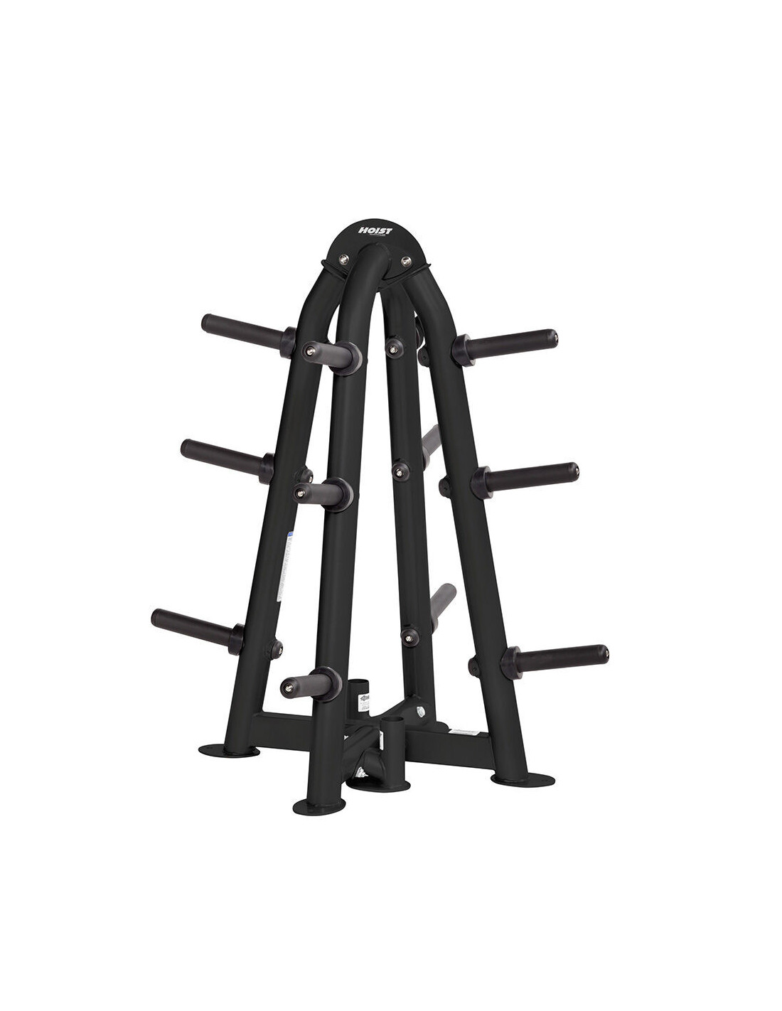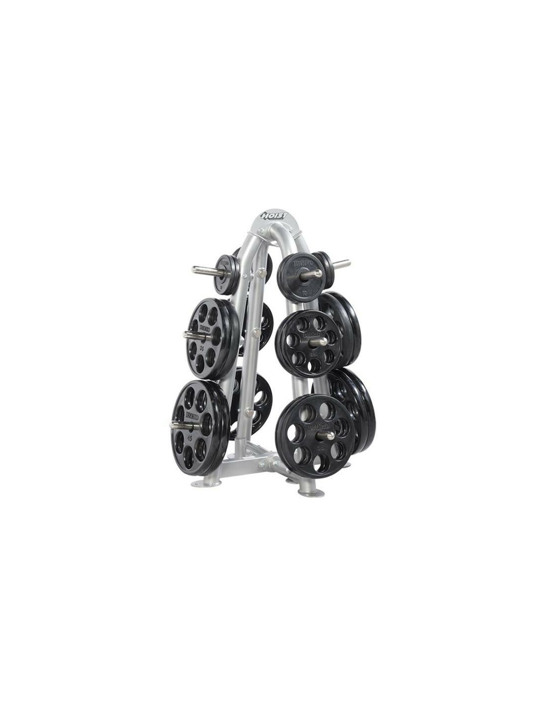 Le range disques olympique Hoist Fitness CF-3444 supporte une charge maximale de plus de 680 kg sur 12 épis. Les supports optionnels permettent de stocker jusqu'à deux barres à la verticale.