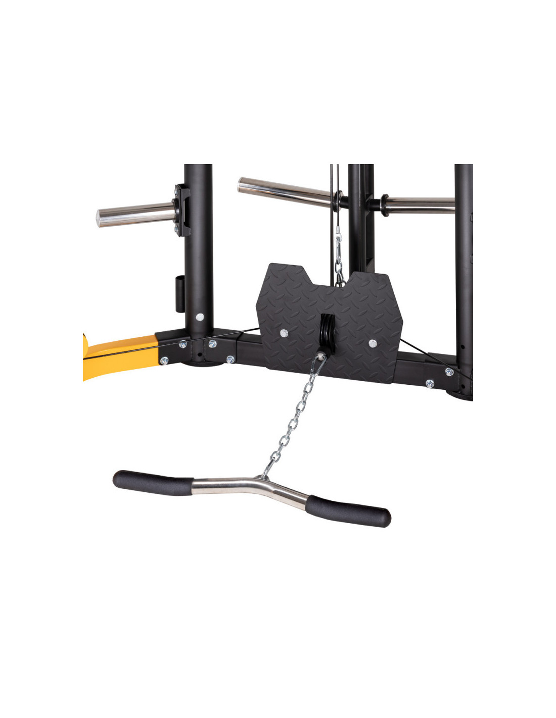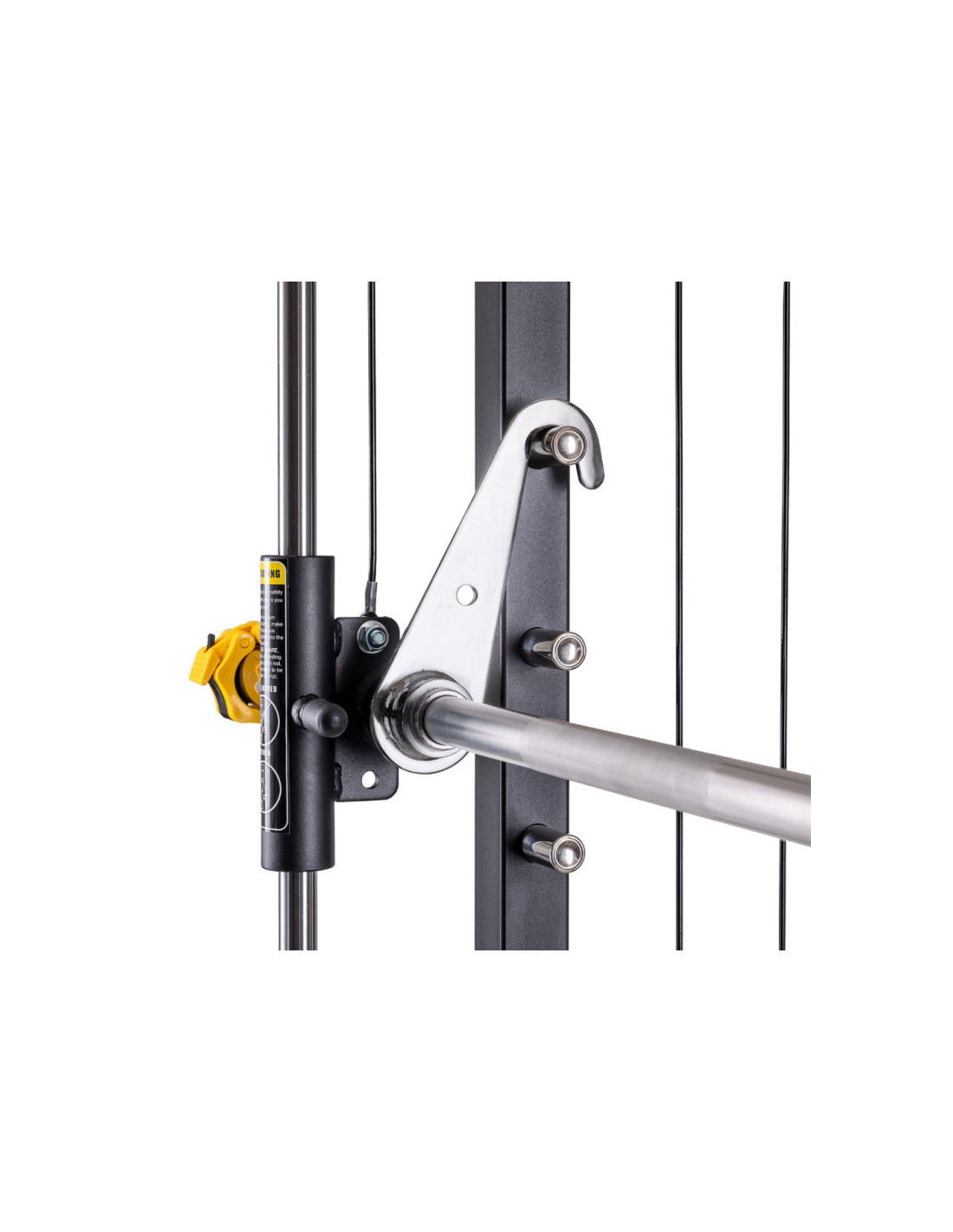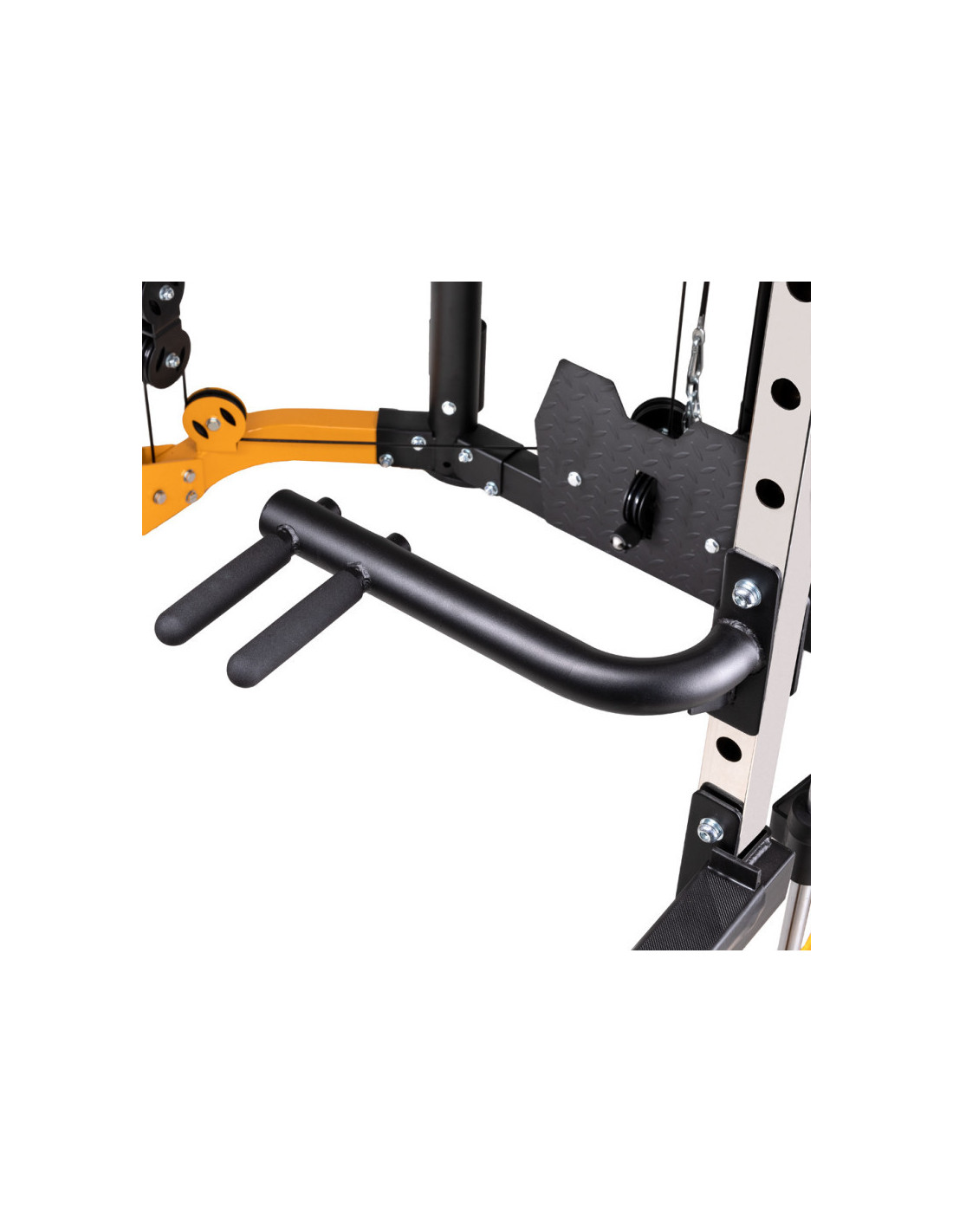 Pour varier vos séances d'entraînement, vous trouverez à disposition une barre de traction avec 5 prises différentes et des poignées à dips réglable en hauteur sur 16 positions. La barre guidée de la smith machine de musculation est dotée de crochets de sécurité pour assister les entraînements et facilement reposer la barre en cas de difficulté.
