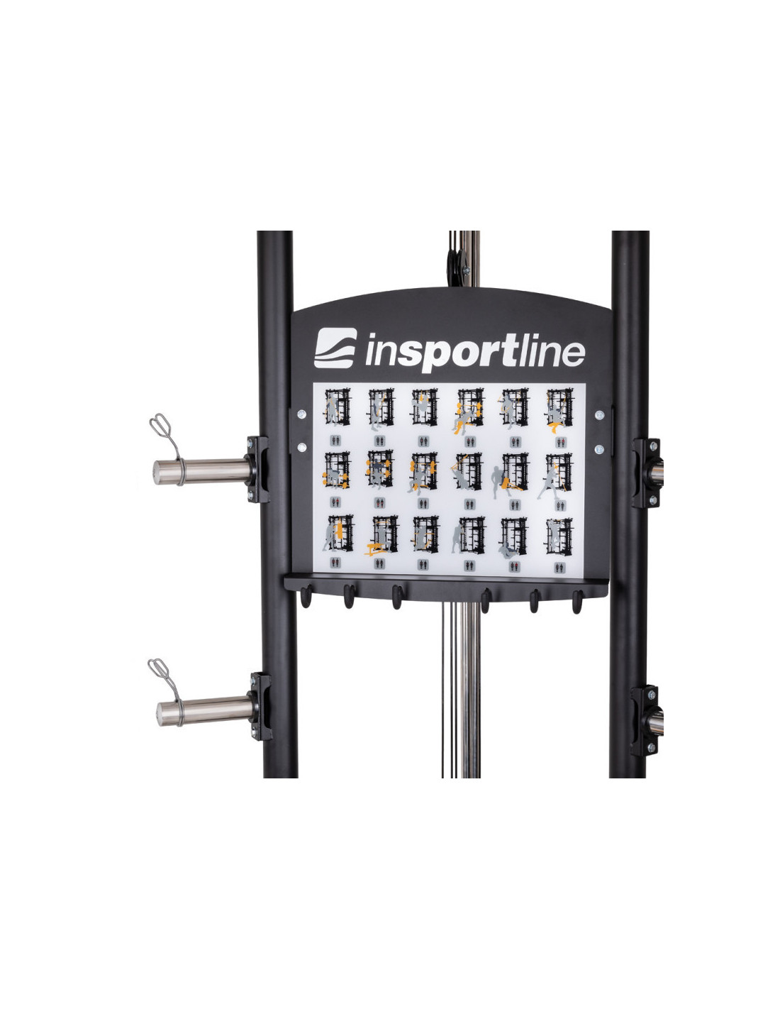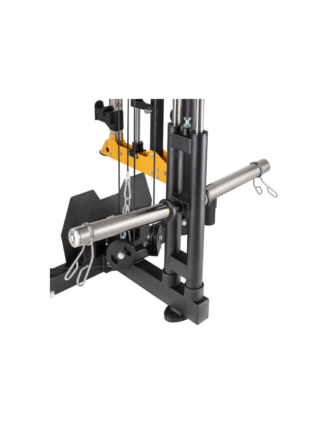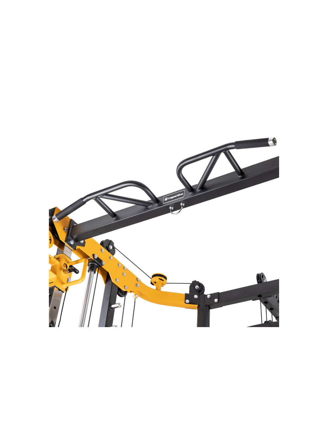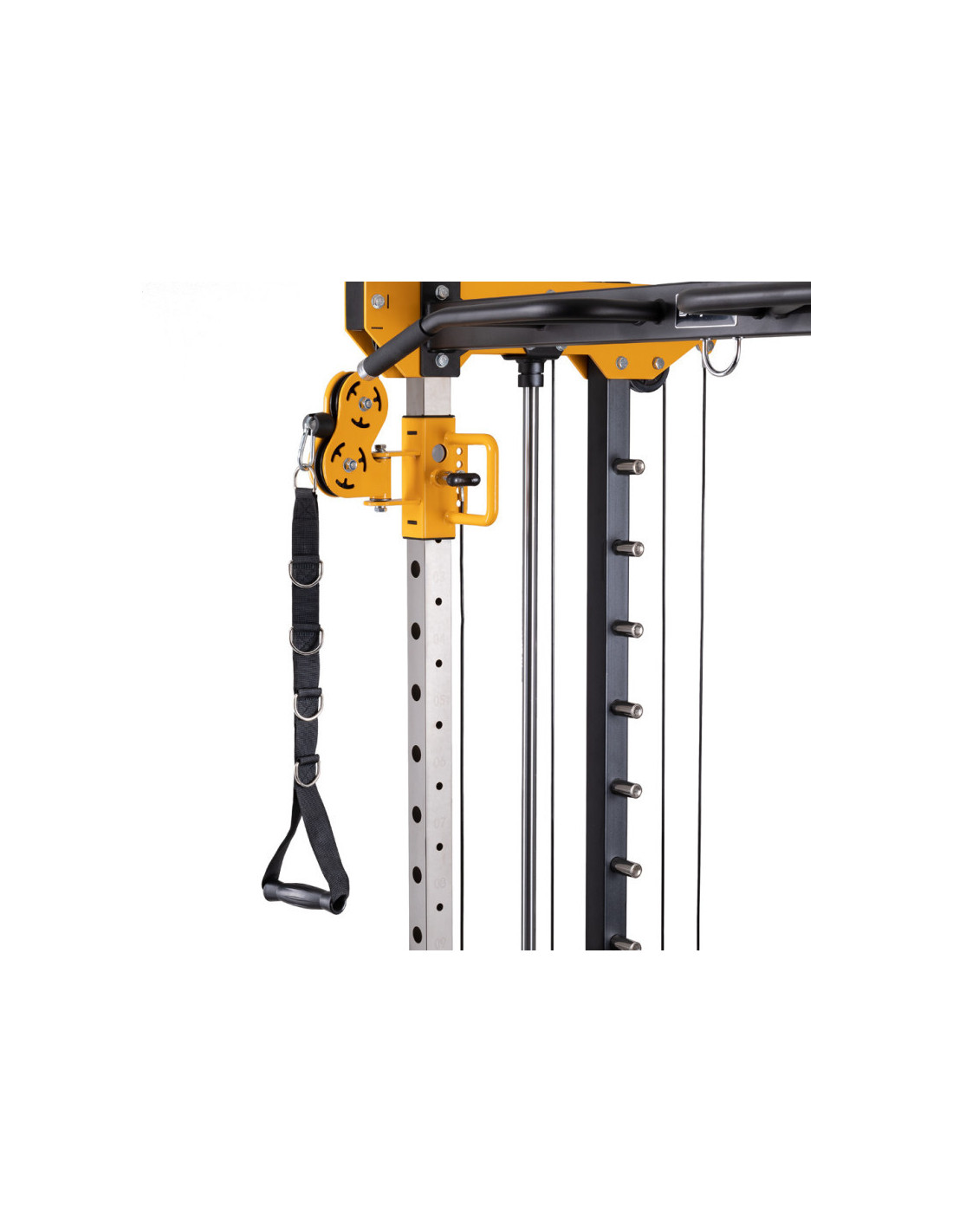 Pour varier vos séances d'entraînement, vous trouverez à disposition une barre de traction avec 5 prises différentes et des poignées à dips réglable en hauteur sur 16 positions. La barre guidée de la smith machine de musculation est dotée de crochets de sécurité pour assister les entraînements et facilement reposer la barre en cas de difficulté.