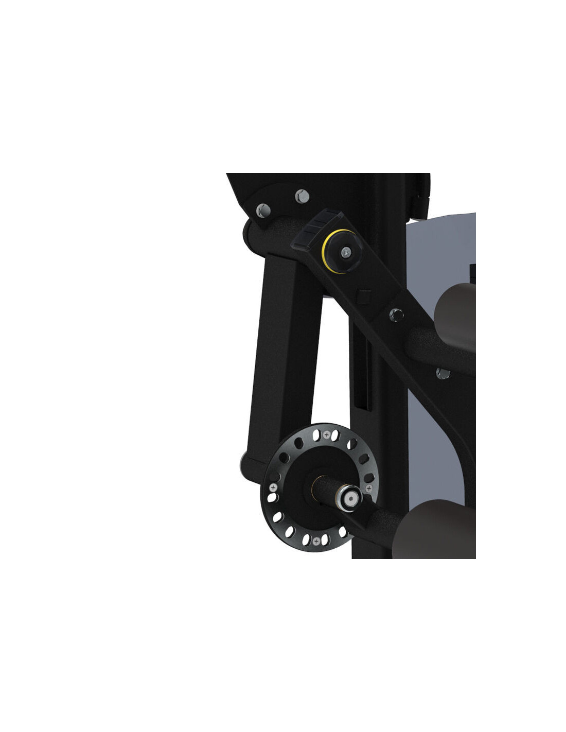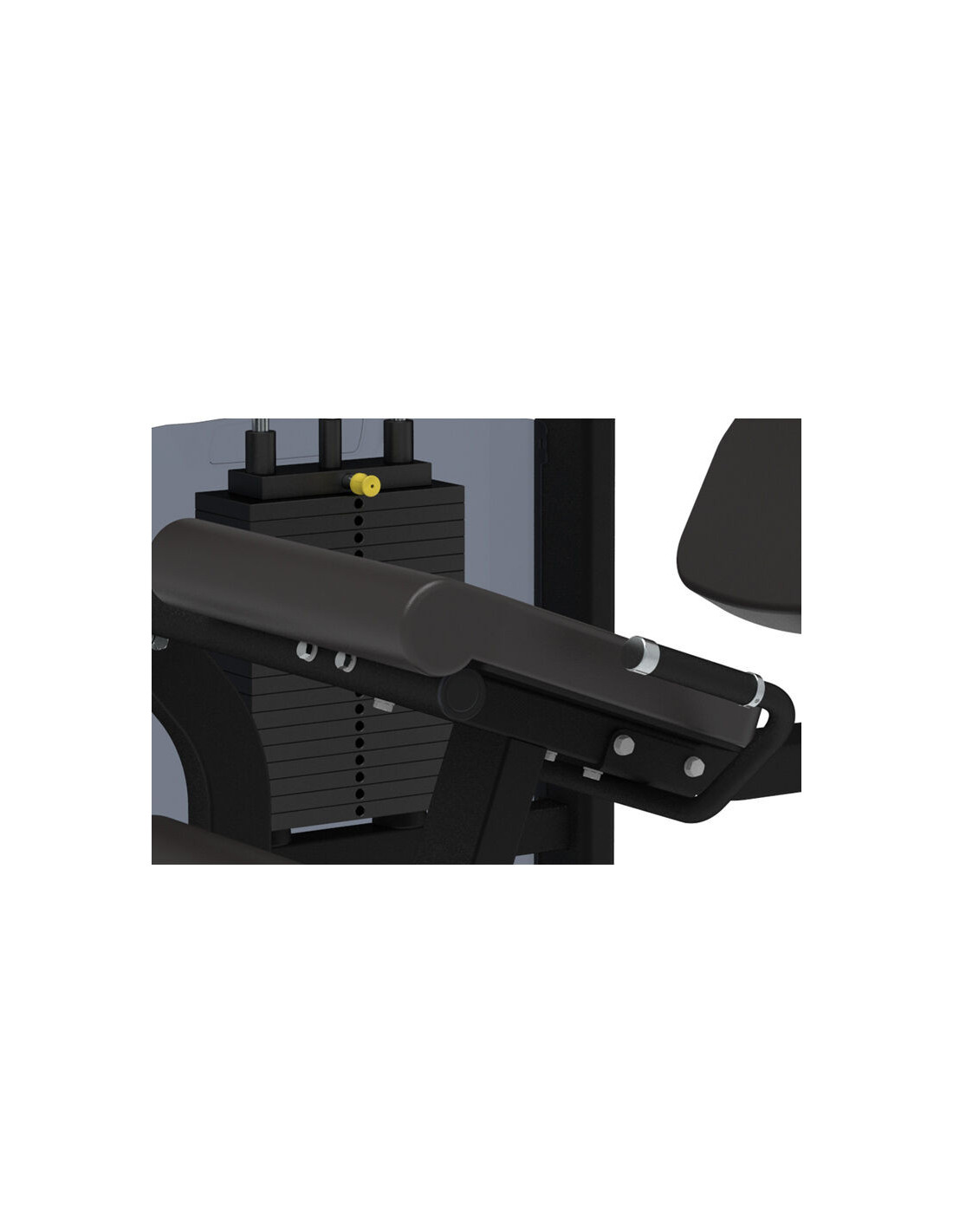 Le repère de pivot en jaune permet aux utilisateurs d'obtenir une position d'exercice correcte facilement et rapidement. Le dossier dispose d'un réglage en profondeur manipulable d'une seule main. L'assise ergonomique offre un bon confort et réduit les contraintes sur les ischio-jambiers pendant l'entraînement. Le rondin tibial en mousse est réglable pour correspondre aux différents gabarits d'utilisateur.