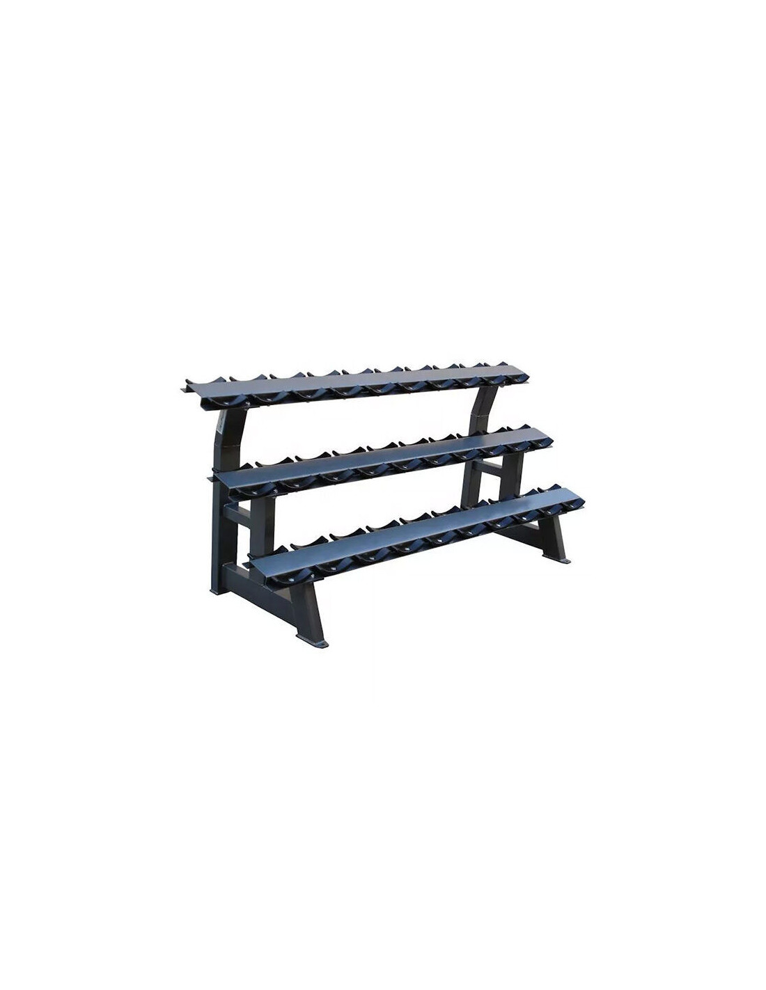 Ce rack 3 niveaux est conçu pour les haltères ronds professionnels dont le diamètre de tête ne dépasse pas 20 à 27 cm (Wynfit, Ivanko, ...). Il permet de ranger facilement 15 paires pour garder votre salle de musculation en ordre. Les niveaux décalés permettent de stocker des haltères ronds et surtout de les prendre plus facilement. Le niveau inférieur, destiné au poids les plus lourds, est presque horizontal pour réduire les contraintes sur les poignets à la prise et à la dépose. Les deux niveaux supérieur sont légèrement inclinés, ils permettent une prise et un posé rapide et en toute sécurité des poids les plus légers. Les berceaux permettent de maintenir les haltères à leur place.