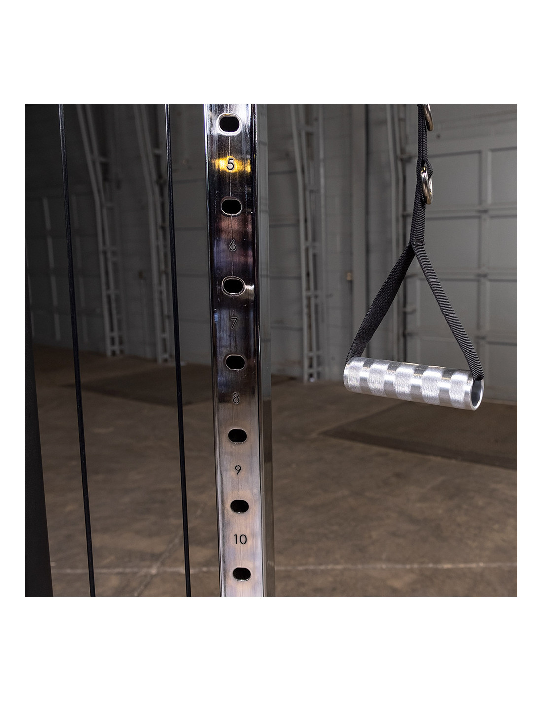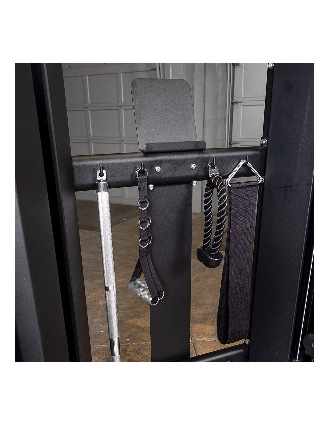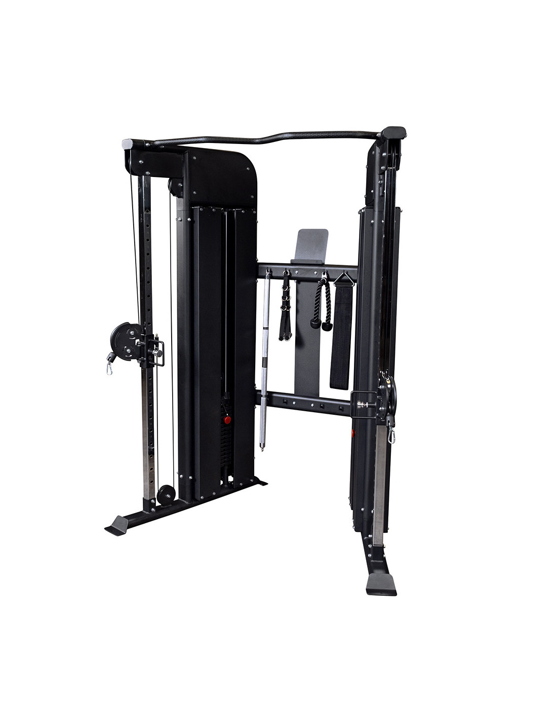Les poulies offrent une liberté d'entraînements, car elles sont pivotantes et réglables. La station comprend des accessoires (poignées d'étrier en aluminium, corde à triceps, ceinture de menton et de dips et double barre pivotante) qui offriront une multitude d'exercices. Le support d'accessoires est inclus et vous permettra de ranger et d'organiser les accessoires inclus.