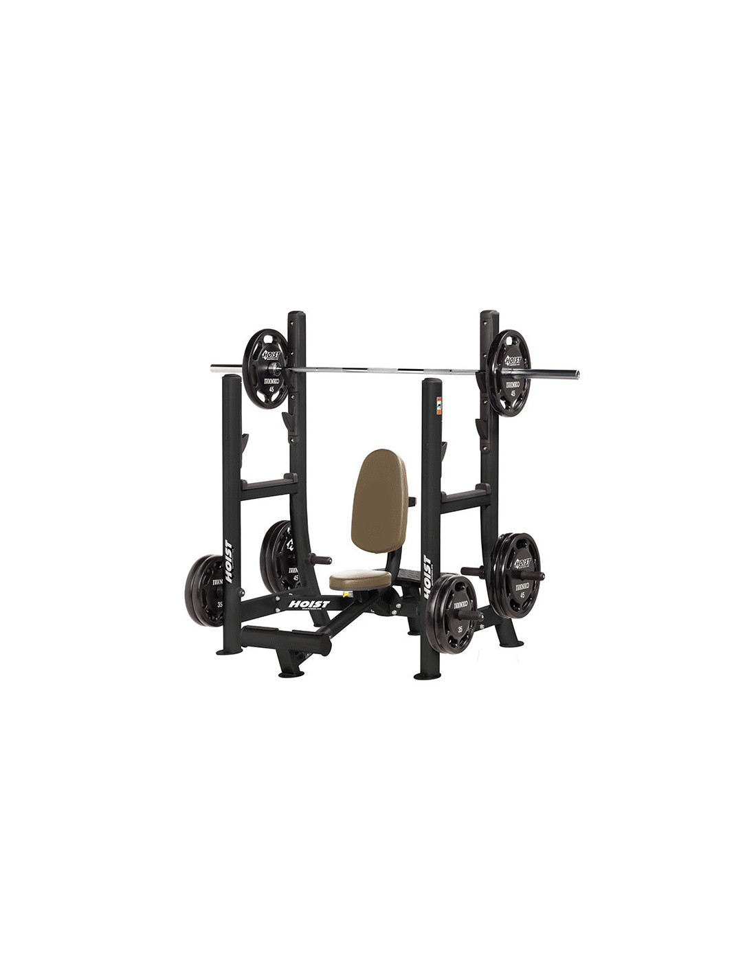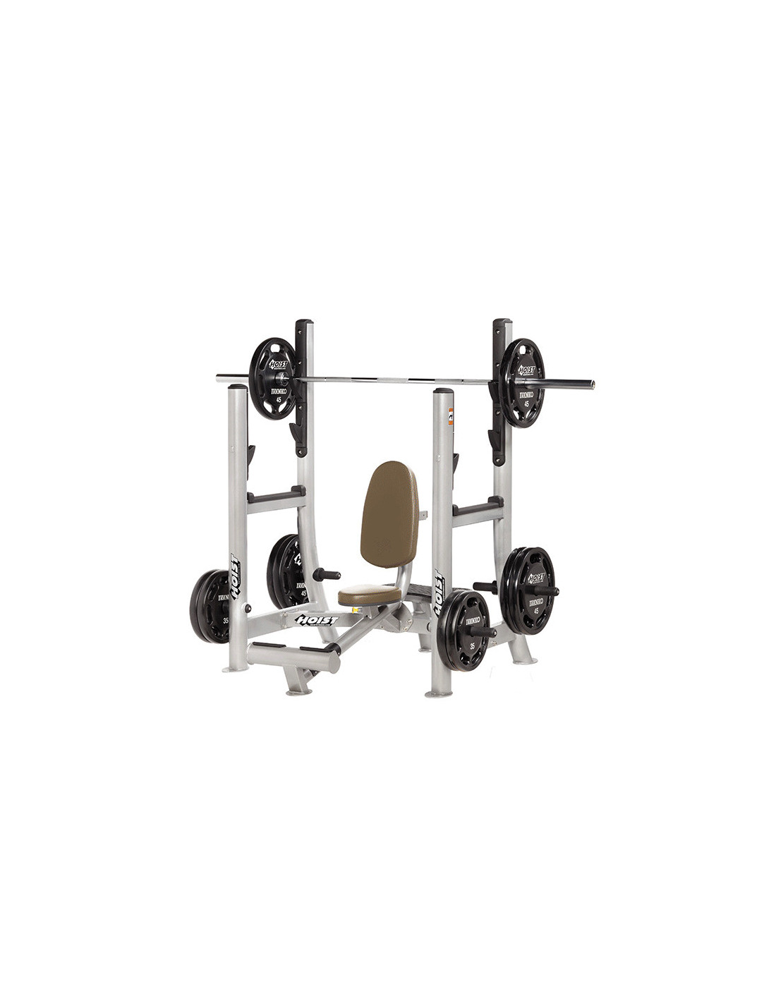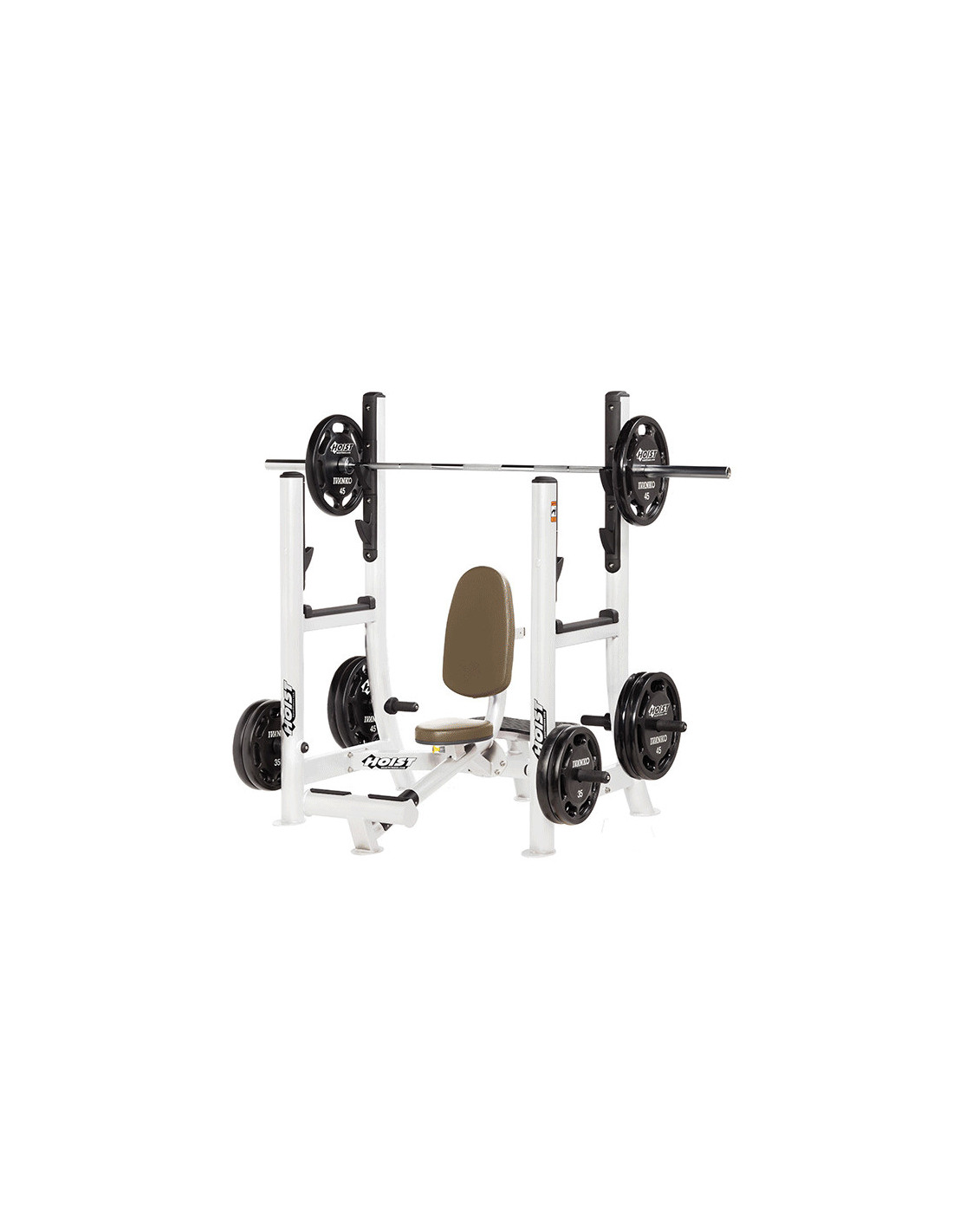 Les deux racks repose barres en vis-à-vis permettent de poser et reprendre la barre de la façon qui vous convient le mieux. Le rack situé à l'avant faisant également office de crochet d'urgence. Les deux racks de sécurité intégrés au châssis et situés à bonne hauteur protègent l'utilisateur en cas de lâcher intempestif de la barre. Tous les racks sont recouverts de polyuréthane pour protéger le châssis, votre barre et réduire le bruit dans la salle.