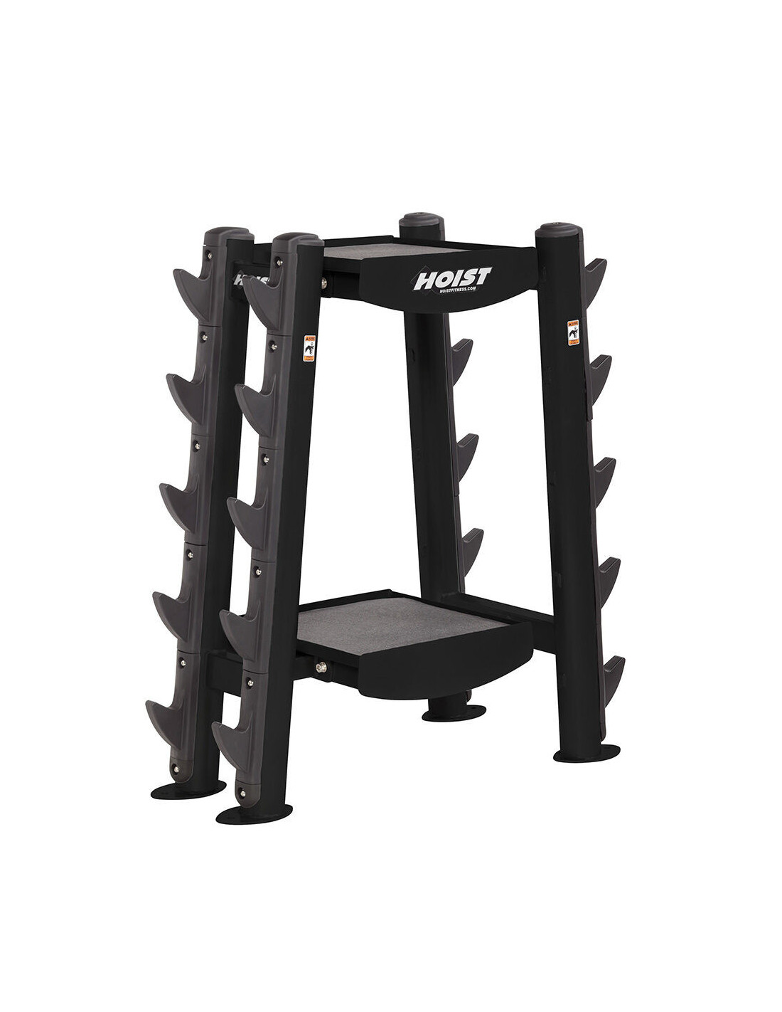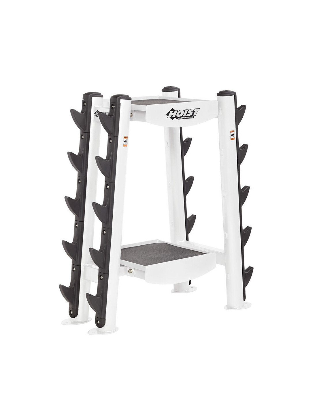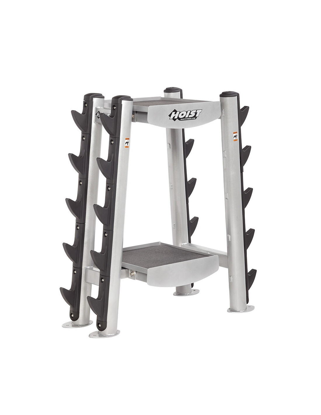 Le range accessoires Hoist Fitness CF-3466 permet de ranger jusqu'à 10 barres et poignées de tirage. Les deux plateaux permettent de ranger les petits accessoires.